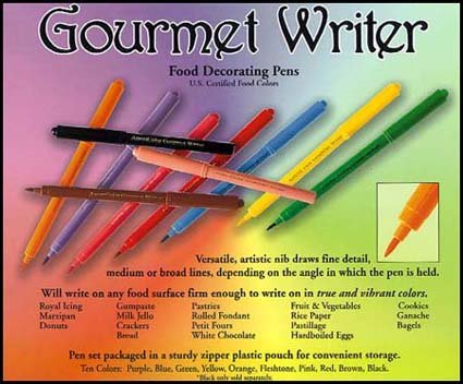 Will write on any food surface firm enough to write on in true and vibrant colors. Perfect for stenciling, stamping, or freehand. The perfect creative tool that will stimulate your imagination. Versatile, artistic nib draws fine detail, medium or broad lines, depending on the angle in which the pen is held.Can be used on: Royal Icing Marzipan Donuts Bagels Gumpaste Milk Jello Crackers Cookies Ganache pastries Rolled Fondant Petit Fours Bread Pastillage Fruits & Vegetables Rice Paper Hardboiled Eggs White Chocolate